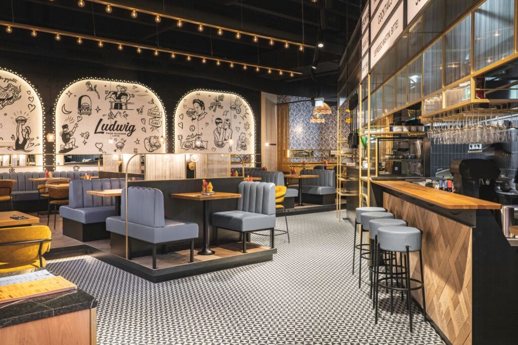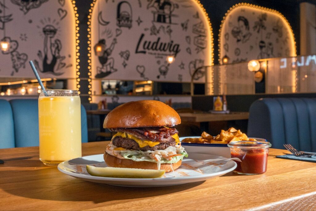 Bio-Rindfleisch, Brioche Bun, Bio-Bacon, eingelegte Zwiebeln, Bio-Bergkäse, Salatblatt, Tomate, Burgersauce, Ludwigs Ketchup